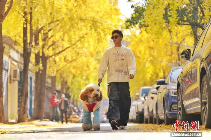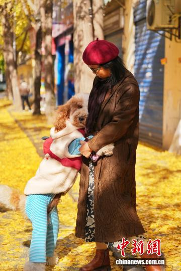 图为游人带着小狗止走正在银杏树停。中新社记者 杨华峰 摄